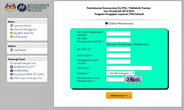 Klik sini -> Permohonan Kemasukan ke IPTA/ Politeknik Primier Sesi Akademik 2015/2016