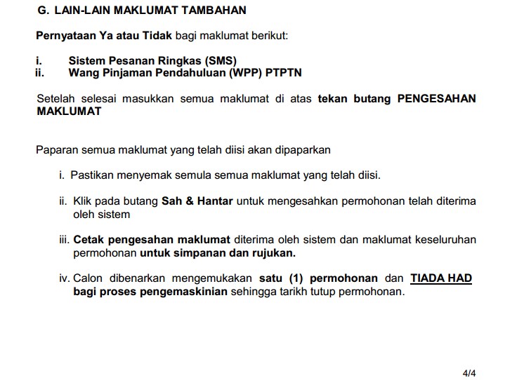- Calon dibenarkan mengemukakan satu (1) permohonan dan TIADA HAD bagi proses pengemaskinian sehingga tarikh tutup permohonan.