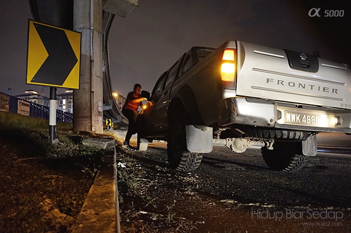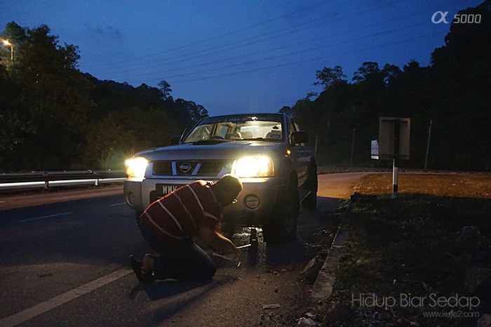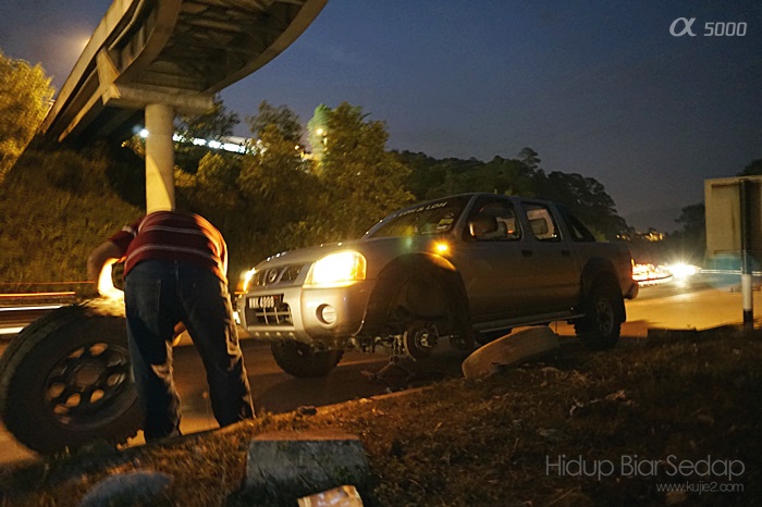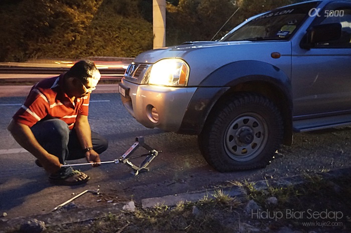 Senang aje nak tukar tayar yang pancit. Lagi senang kalau hanya memerhati macam saya..hihi. Sambil ambil gambar gunakan kamera baru Sony Alpha5000 .