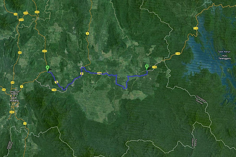 Laluan Gua Musang – Felda Aring lebih kurang 70 KM sebelum memasuki jalan Ke Kuala Berang melalui Tasik Kenyir.