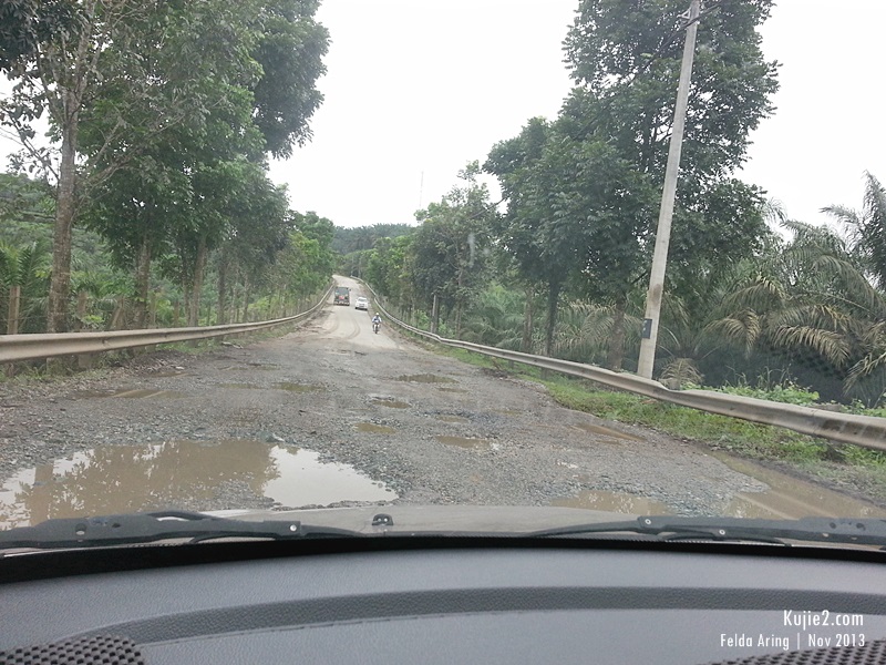 Keadaan jalan yang perlu diberi perhatian lebih kurang 2 kilometer dan 500-600 meter keadaannya teramat teruk. Kereta biasa pun nak lepas kena berpusing sana sini cari ruang takut tersangkut di dalam lopak. Kalau kereta yang dimodified, yang dah lower tu mungkin lebih laju sikit dari kura-kura.