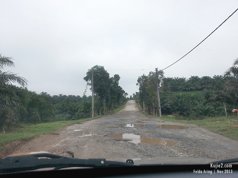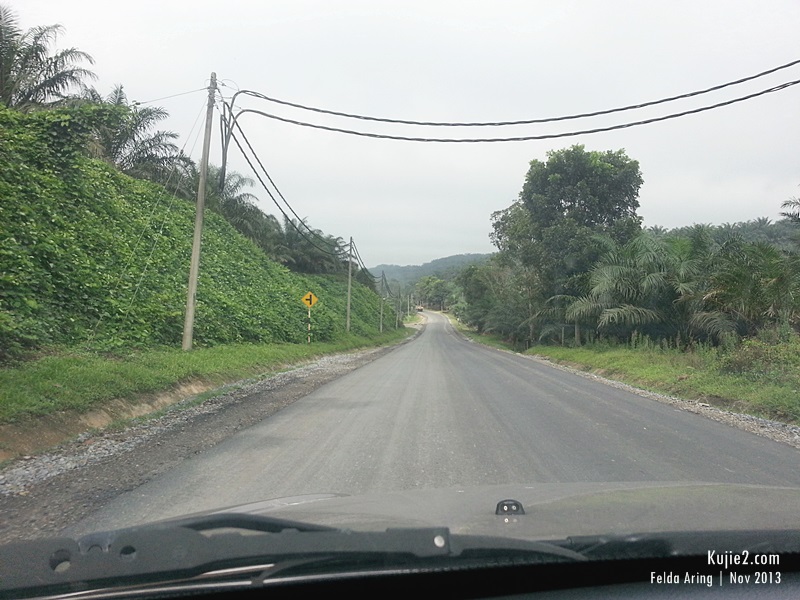 Jalan yang melalui Felda Aring lebih kurang 30 kilometer. Kalau bukan musim hujan, jalan ini berdebu dan pokok-pokok ditepi jalan diseliputi debu putih macam musim salji.