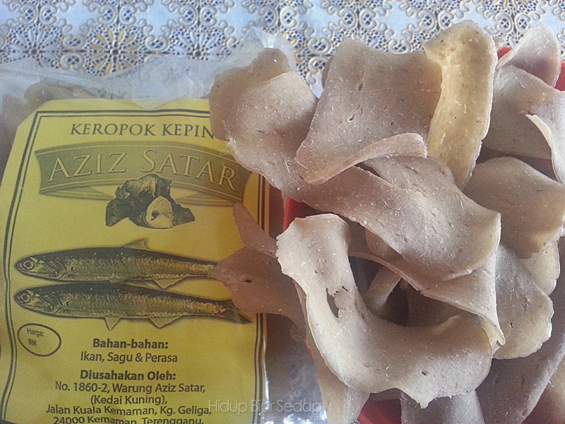 Saya pun beleklah jenama pembuat keropok keping yang sedap ini. Tengok saja alamat Keropok Keping Aziz Satar, Kedai Kuning, Kanpung Geliga, Kemaman, saya dah tahu kerana pernah ke sini.