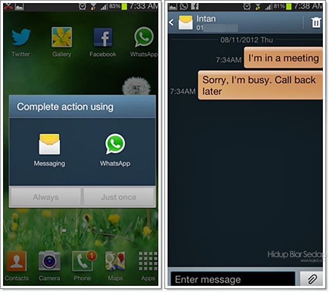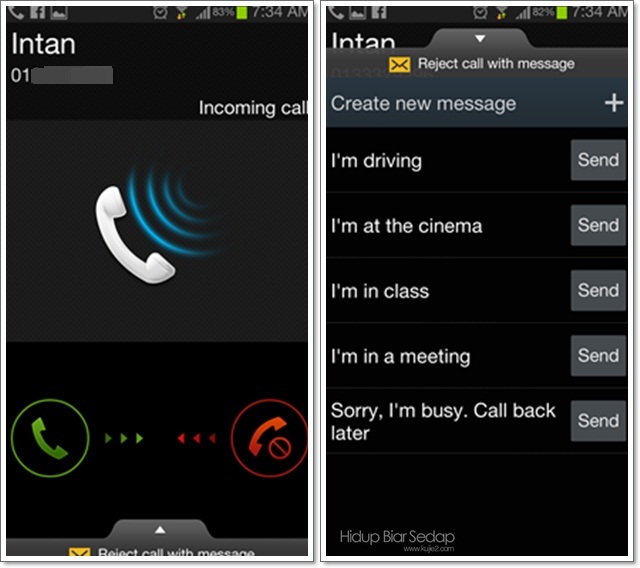 Boleh pilih nak hantar pesanan ‘reject call ‘ melalui WhatsApp atau SMS.