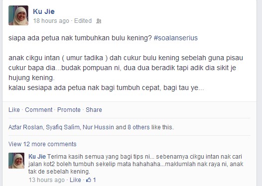 Bila saya bertanya soalan ini kepada kawan-kawan di Facebook, rupanya ramai juga yang ada pengalaman anak mereka yang pernah cukur bulu kening. Ini bukan kes cukur bulu kening nak bentuk semula tu… ini kes cukur seluruh tanpa dia sendiri tau kesannya. Yang sengaja cukur dan bentuk tu dia buat secara sengaja dan jauh disudut hati dia pun sedar hukum dan larangan, cuma menafikan saja sebab nak ikut kata hati.