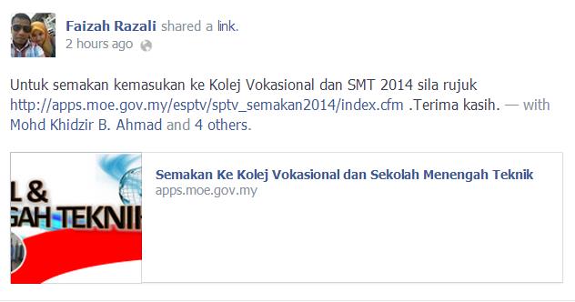 Mengikut status dari Facebook Bptv Kpm, pelajar boleh membuat semak kemasukkan ke kolej vokasional dan sekolah teknik 2014 melalui link yang diberikan diatas.