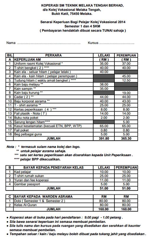 Ini adalah senarai keperluan pelajar Kolej Vokasional Melaka Tengah