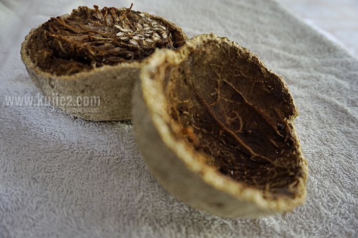 Dengan perasaan ingin tahu yang memuncak, saya paksa adik ipar untuk belah buah kawis ni… hahah..kulit dah keras, bukan senang nak belah.
