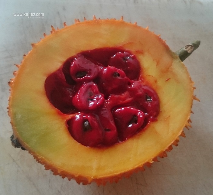 Sekali pandang macam buah durian. Rasanya masam-masam macam strawberry. Nampaknya kena tambah gula.