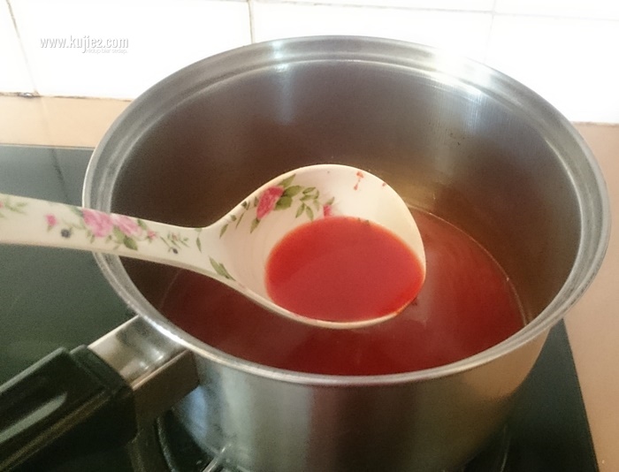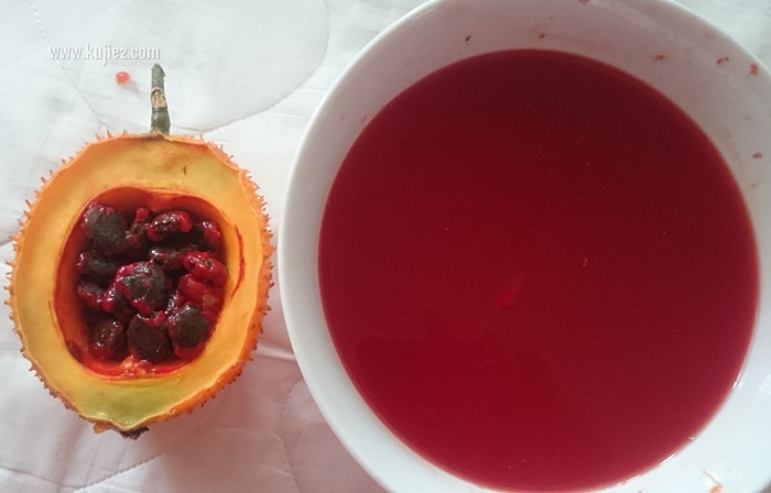 Campur pati buah Gac dengan air dan gula untuk mendapatkan rasa yang diingini.