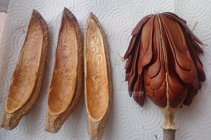 Buah yang matang tu kita jemur dan akan pecah/merkah seperti buah getah. Dalamnya ada kepingan nipis kelongsong warna cokelat yang mengandungi biji di dalam berwarna putih. Bijinya ringan dan akan diterbangkan angin mengikut proses semulajadi. Sebab itulah ada yang memanggil buah Tunjuk Langit ini sebagai ” Buah Putar Angin”