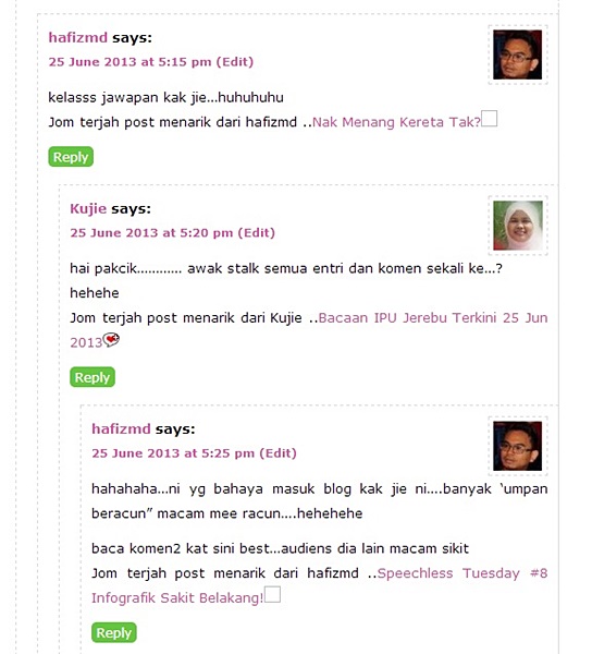 Ramai yang pernah hantar email mengatakana mereka suka interaksi antara para pengomen di blog ini. Mereka cakap kebanyakkan pengomen berbual mesra dan bukan seperti dipaksa-paksa untuk mendapatkan kelebihan backlink untuk mereka. Pengomen blog ini gembira dan ikhlas untuk menulis komen. Pengomen di sini suka berkongsi info dan menambahkan pengetahuan kepada pembaca, bukan sekadar komen kosong.
