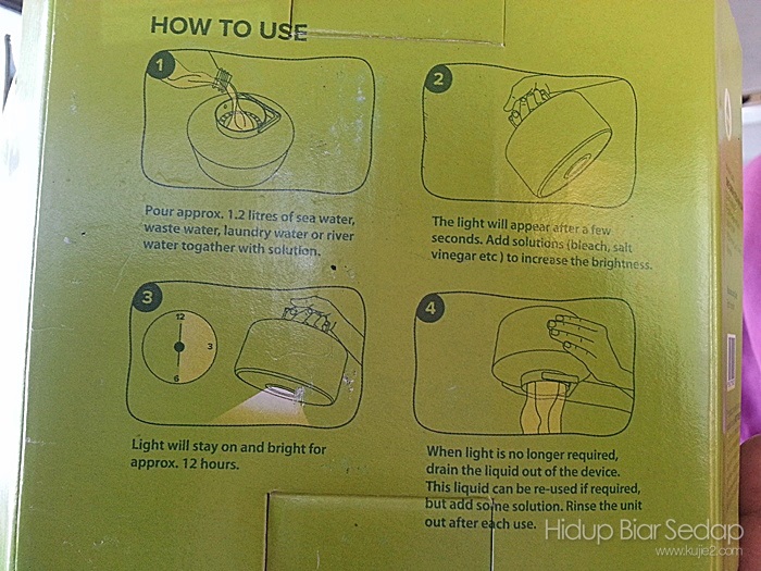 Isi air – air laut, air tawar, air bekas basuhan atau air kumbahan. Tak perlu petik suis, lampu akan menyala.