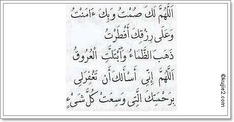 Ertinya: Ya Allah! Kerana Engkau aku berbuka puasa dan kepada Engkau aku beriman dan atas rezeki dari Engkau aku berbuka puasa telah hilang dahaga sudah menjadi basah segala urat. Ya Allah! Aku minta diampuni dosaku dengan rahmat Engkau yang meliputi segala sesuatu.