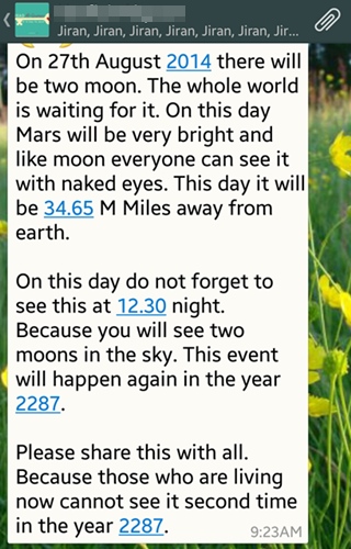 Pada hari ini jangan lupa untuk melihat ini pada jam 12.30 malam. Kerana anda akan melihat dua bulan di langit. Peristiwa ini akan berlaku lagi pada tahun 2287.
