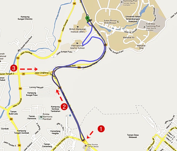 - Dari Utara melalui MRR2 dari Batu Caves atau Kepong, terus ambil lorong paling kiri mengikut papan tanda UniKL BMI atau UIA