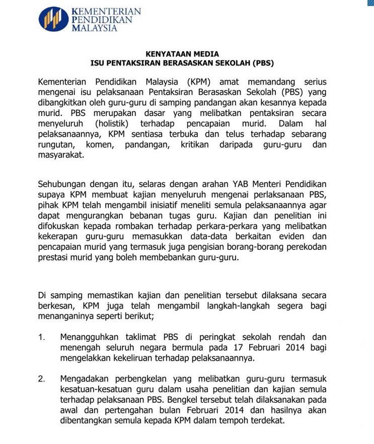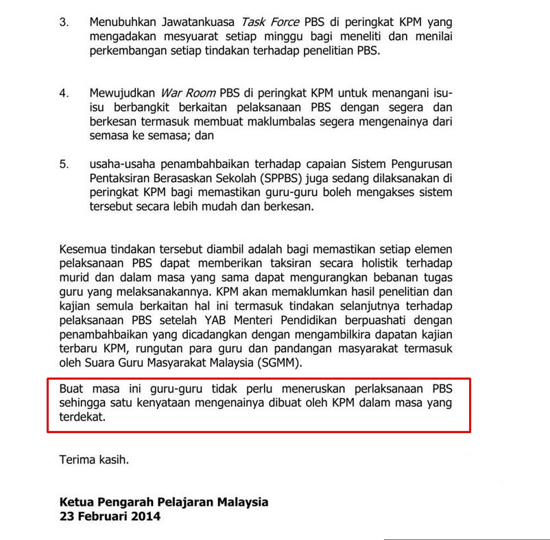Kalau PBS ( Pentaksiran Berasaskan Sekolah ) tidak diteruskan, bagaimana dengan PBS yang telah mereka lalui sejak 2 tahun lepas? Dokumen dan sistem fail yang khabarnya sebesar bilik darjah?