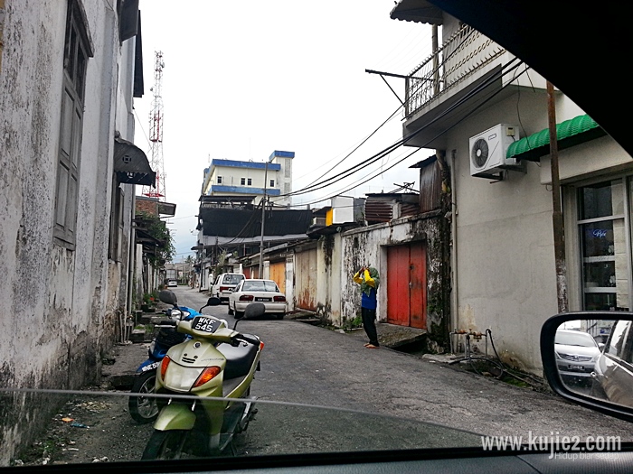 Dari dalam kereta menggunakan kamera telefon sahaja. Inilah lokasi kedai tersebut. Nampak unik dengan warna menyerlah disebalik deretan bangunan lama yang juga menarik. Tentu ada banyak sejarah yang tercatit sejak pembinaanya.