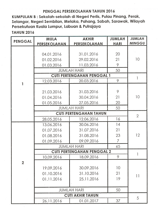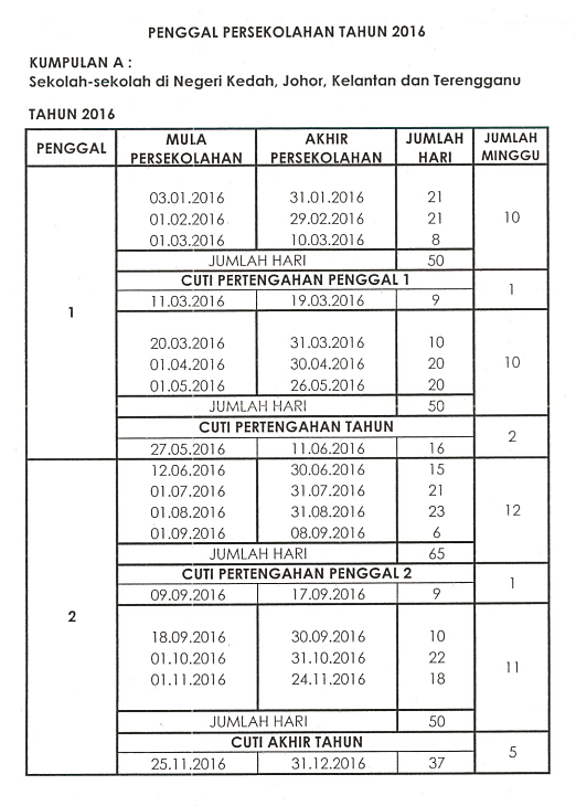Sesi Persekolahan 2016 akan bermula pada 03/01/2016 ( Ahad ) bagi negeri Kedah, Johor, Kelantan dan Terengganu. Bagi negeri Perlis, Pulau Pinang, Perak, Selangor, Negeri Sembilan, Melaka, Pahang, Sabah, Sarawak dan Wilayah Persekutuan ( KL, Putrajaya & Labuah ) sekolah akan dibuka pada 04/01/2016 ( Isnin )