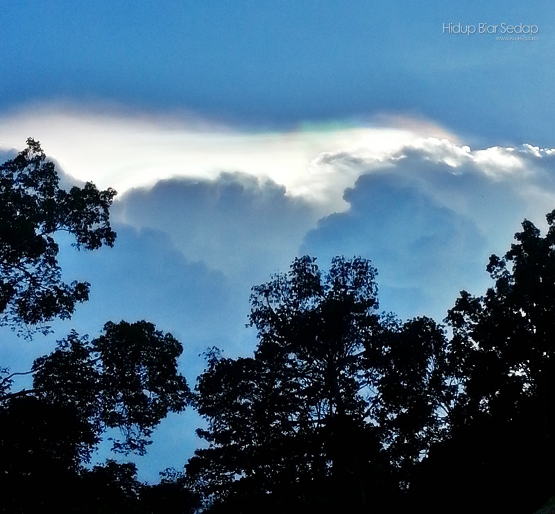 Dari celah awan bersilau cahaya matahari dan memanjang di sisi awan adalah warna-warna pelangi. Masha’Allah… itu adalah fenomena langit paling indah pernah saya lihat. Adakah ini yang sering dirujuk sebagai aurora dalam bidang astronomy?