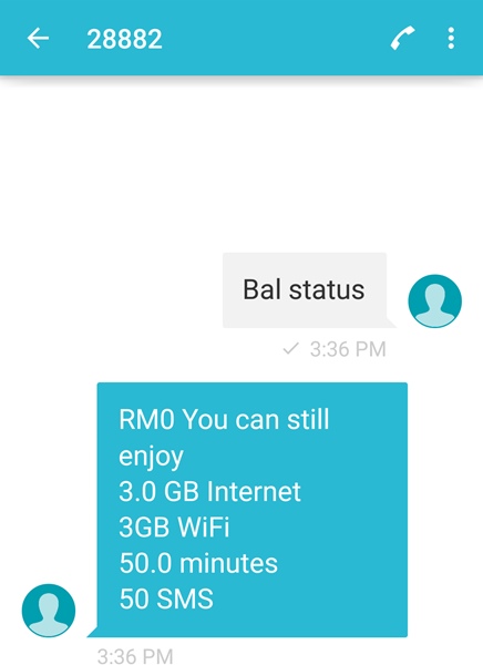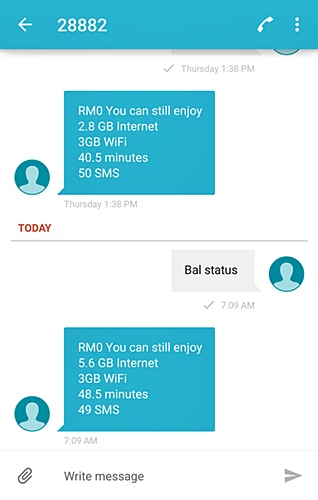 Nak check baki data Celcom, panggilan atau SMS, taip Bal Status dan hantar ke 28882.