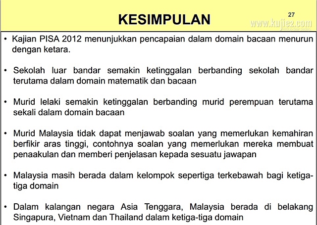 Menurut keputusan PISA pada 2012, pelajar Malaysia mendapat markah di bawah purata atau berada di tangga 52 daripada 65 negara berbanding pelajar Vietnam berada di tangga ke-17 .