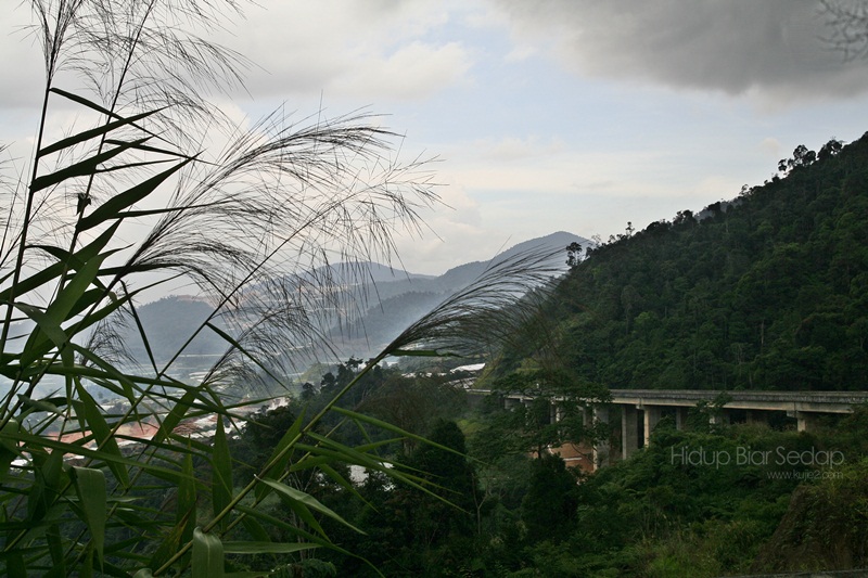 Keadaan cuaca mendung mengiringi perjalanan pertama kali melalui jalan ini. Terpegun terkejut terkesima melihat seluas mata memandang segala bukit bukau diratakan untuk projek penanaman sayur. Kata Along macam nak supply sayur untuk seluruh Malaysia saja.