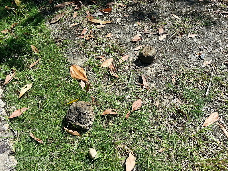 Tekaan kami benar, memang pemilik najis inilah yang menyebabkan plak tersebut pecah. Mungkin badannya gatal-gatal dan terjumpa bucu tajam yang sesuai untuk bergesel. Kalau anda melihat beberapa binaan tugu yang tersumbing atau batu batan binaan yang mungkin retak atau rosak, cubalah faham bahawa itu disebabkan kawasan ini adalah tempat laluan gajah.