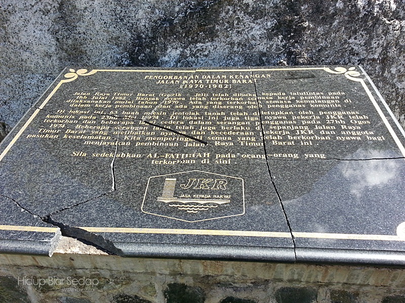 Plak yang bertajuk Pengorbanan Dalam Kenangan Jalan Raya Timur Barat  ( 1970 – 1982 )  didirikan oleh pihak JKR bagi  memperingati anggota-anggota tentera serta pekerja Jabatan Kerja Raya (JKR) yang terkorban demi mempertahankan dan menjayakan projek jalan raya tersebu .