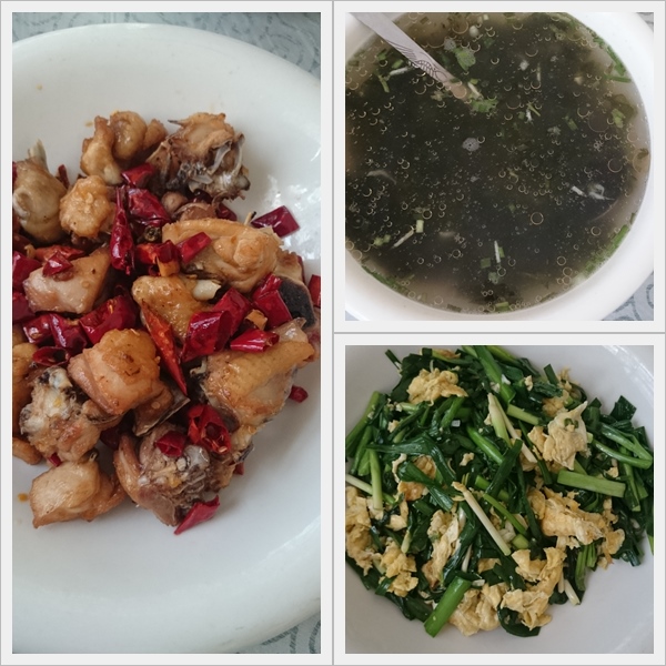 Menunya nasi bersama ayam goreng, sup rumpai laut dan telur goreng kucai. Seperti biasa, setiap hidangan dimulai dengan teh hijau cina.