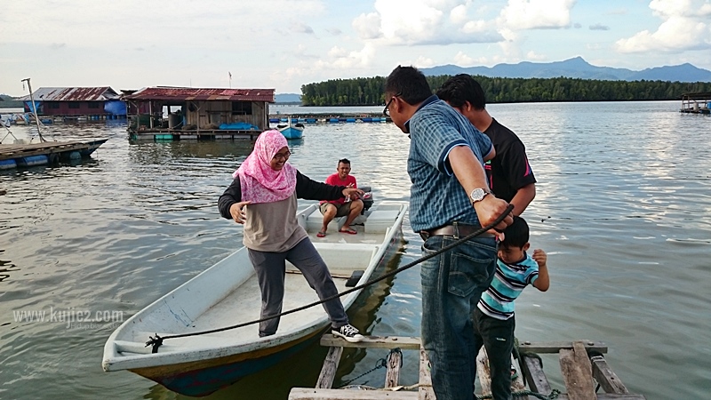 Kami naik bot untuk ke sangkar tempat ikan diternak.