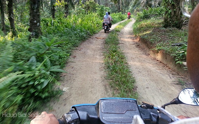 Tinggalkan kereta di rumah penjaga kebun dan bermotosikal di bawah kebun redup dan sejuk. Sakit juga bontot bila melalui jalan yang berlopak, berbatu dan beralun.