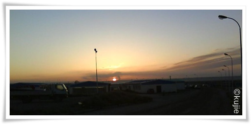 Kat sana tak ada bukit bukau pokok macam di tempat kita. Matahari terbit saja – terus terang. Bukan beransur-ansur memancarkan sinarnya di celah bukit atau bangunan tinggi.