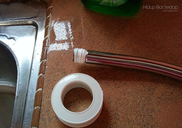 Satu lagi kes membabitkan lubang pada sinki tempat letak paip yang tak boleh ditutup. Cara nak selesaikannya, saya beli selotip timah yang digunakan untuk menampal periuk bocor. Harganya dalam RM 4 sekaki. Saya tampal benda tu , selesai masalah.