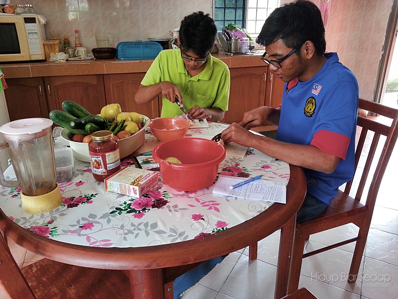 Dari dulu, kalau nak buat majlis makan-makan macam ni, seluruh ahli keluarga ambil bahagian. Potong bawang atau siap-siapkan keperluan MasterChef nak masak nanti. Cik Intan tengah merebus spaghetti masa ni.