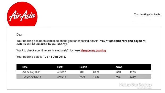 Selepas ditolak campur dan bahagi, saya bulatkan hati membuat keputusan akhir. Kami akan ke Kuching. Saya tak dapat tiket percuma promosi Air Asia tetapi saya mendapat tiket harga murah. Walaupun bukan tiket percuma, tetapi harga ini masih murah dan memenuhi kemampuan kami.