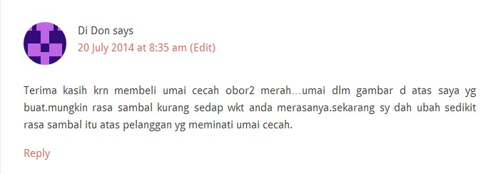 Tak sangka la pula tuan umai dah jumpa entri pasal umai dia kat blog ni. Siap perbaiki rasa sambal atas komen dari pelanggan. Ini baru penjual yang mementingkan kepuasan pelanggan.