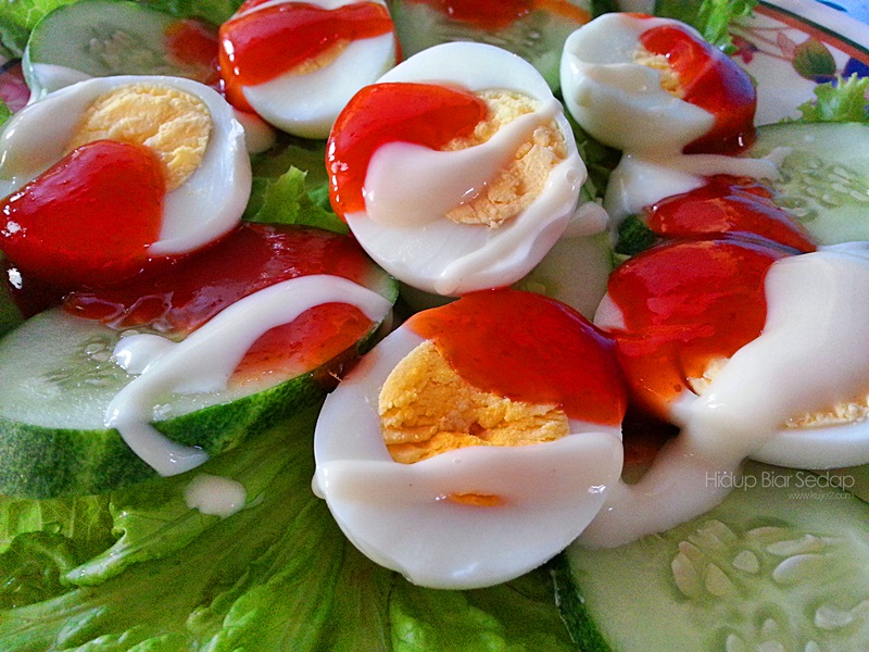 - Telur dibelah dua dan susun atas ulam-ulaman tadi.
