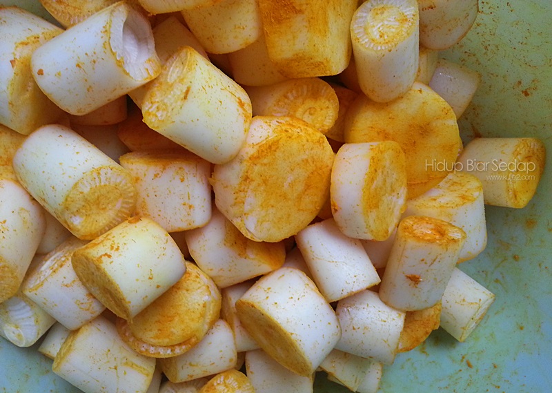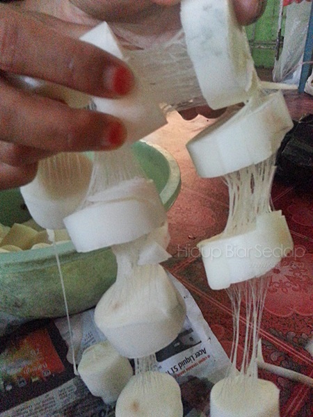 Potong umbut pisang tu 1 – 1½ inci besarnya. Bahagian paling penting di sini, urat atau tali atau getah pisang yang berjurai-jurai tu kena buang. Kalau tak buang umbut pisang tetap berangkai-rangkai apabila di masak. Tak putus. Urat-urat yang keluar tu memang kuat Bila kita tarik, uratnya makin memanjang. Kena buang sampai habis.